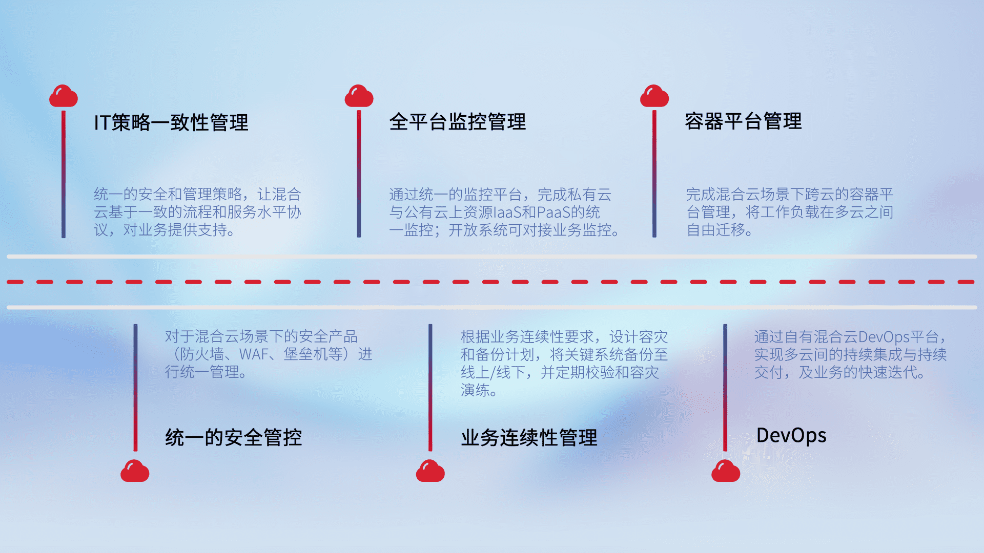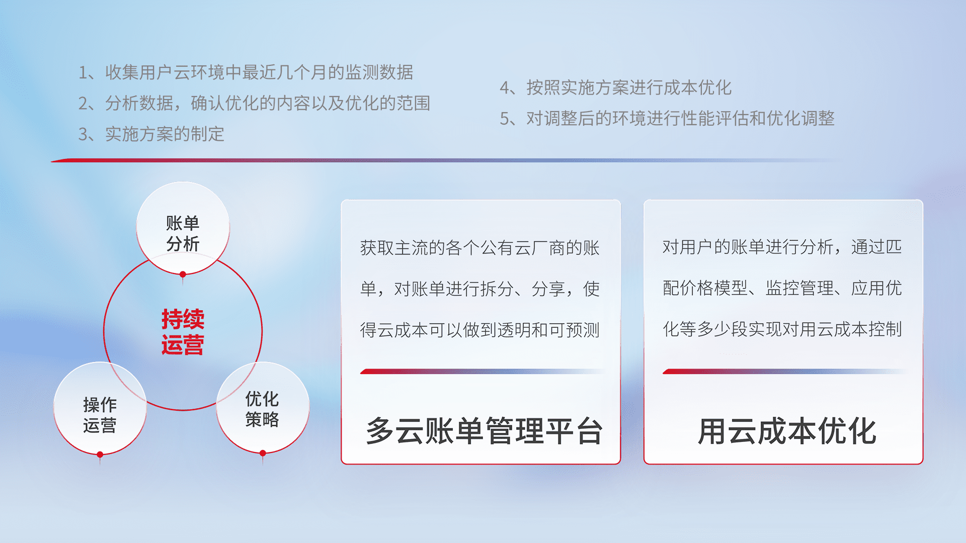 通过多云纳管,,,以统一的资源数据模型把客户的云资源进行抽象和封装,,,进而实现对多云资源的统一操作,,,保障云资源管理的可靠性、、、稳定性与可用性。。量身定制化运维内容,,配置、、、开发运维、、补丁管理、、、备份、、、监控、、、、认证和访问管理、、、审计和日常巡检等,,保障在用云过程中的可靠度,,,,稳定度以及高可用率。。。